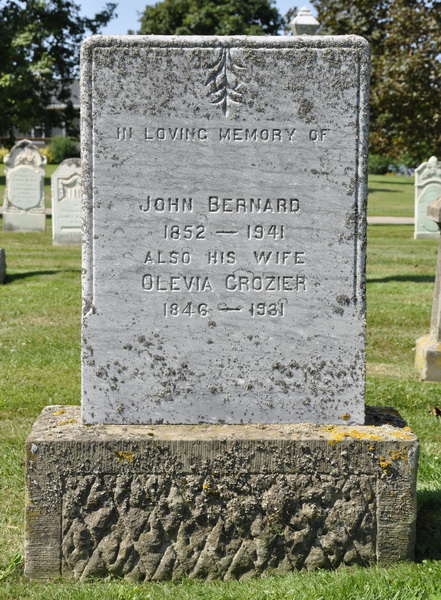 | Burial | He was buried in Princetown Cemetery, Malpeque, Prince County, Prince Edward Island, Canada, 46.52976, -63.68760G. Inscription: In Loving Memory of / John Bernard / 1852 - 1941 / Also His Wife / Olevia Crozier / 1846 - 1931.3 Tombstone, John Bernard (1852-1941), his wife Olivia/Olevia Crozier (1846-1931). Peoples Cemetery, Malpeque, Prince County, Prince Edward Island, Canada.  Front inscription detail. |
