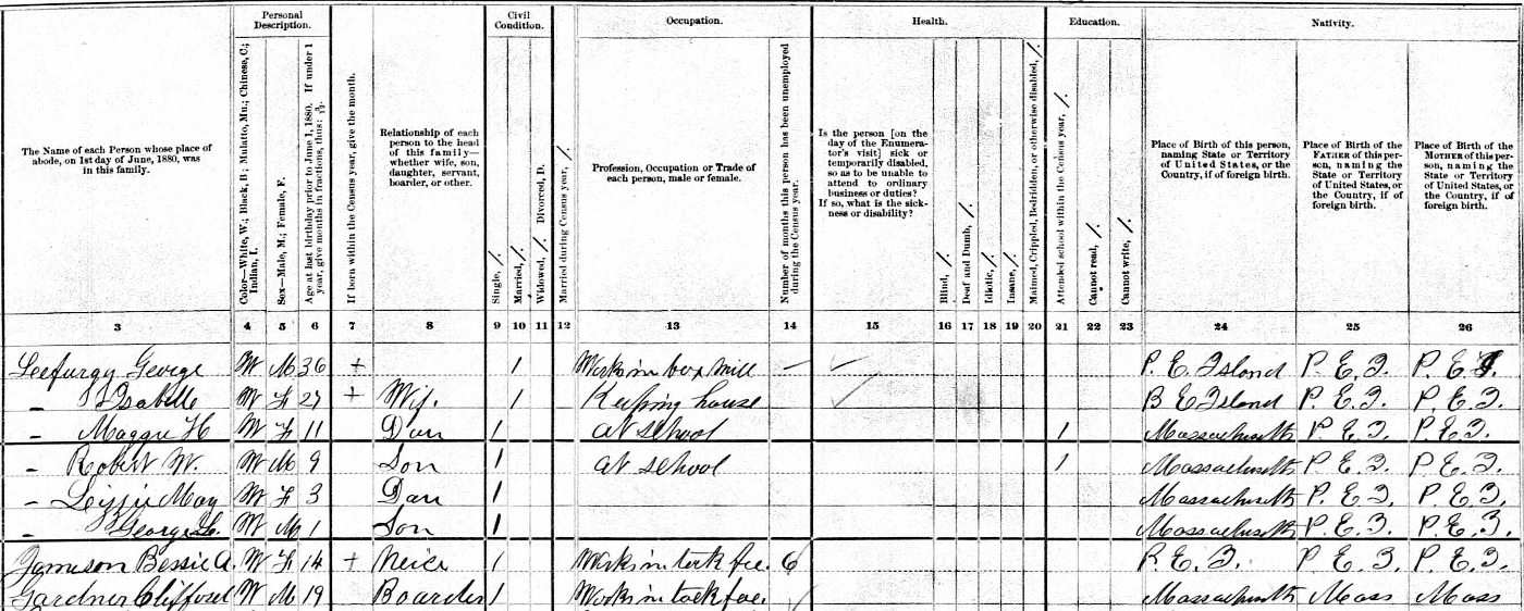 | Census | George Lefurgey was head of the household in the census on 21 June 1880 in Abington, Plymouth County, Massachusetts, USAG. Enumerated in the household with George (age 36) were his wife Isabelle Walker (age 27), their children Maggie (age 11), Robert (age 9), Lizzie (age 3) and George (age 1), and Isabelle's niece, Bessie Jamieson (age 14), daughter of William Jamieson & Ann Bramble Walker. There was also an unrelated boarder. George worked in a box mill, Maggie & Robert were at school.4 1880 US Census, Abington, Plymouth County, Massachusetts. Household of George Lefurgey, his wife Isabella/Isabelle Walker, their children Maggie, Robert, Lizzie & George, and Bessie Jamieson, a niece of Isabella. |