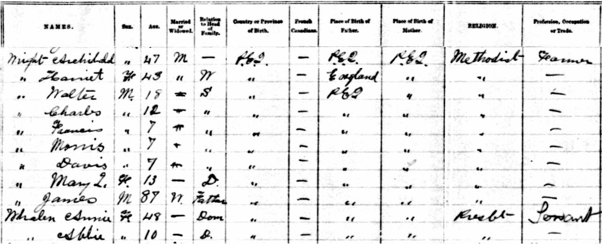 | Witness | She was enumerated on the census on 7 April 1891 in the household of Thomas Archibald Wright in Lot 26, Centreville Bedeque, Prince County, Prince Edward Island, CanadaG. included the household with Archibald (age 47) were his wife Harriet Beer (age 43), their children Walter (age 18), Charles (age 12), triplets Francis (age 7), Morris (age 7), Davis (age 7) & Mary (age 13), and Archibald's widowed father James Wright (age 87). Also in the household were unrelated Annie Whalen (age 48), a servant, and her daughter Abbie (age 10). Archibald was a farmer. The family religion was Methodist.3 1891 Canada Census, Centreville Bedeque, Lot 26, Prince County, Prince Edward Island. Household of Archibald Wright, his wife Harriet Beer, their children Walter, Charles, Francis, Morris, Davis & Mary, and Archibald's widowed father James Wright. Also in the household were unrelated Annie Whalen, a servant, and her daughter Abbie. |