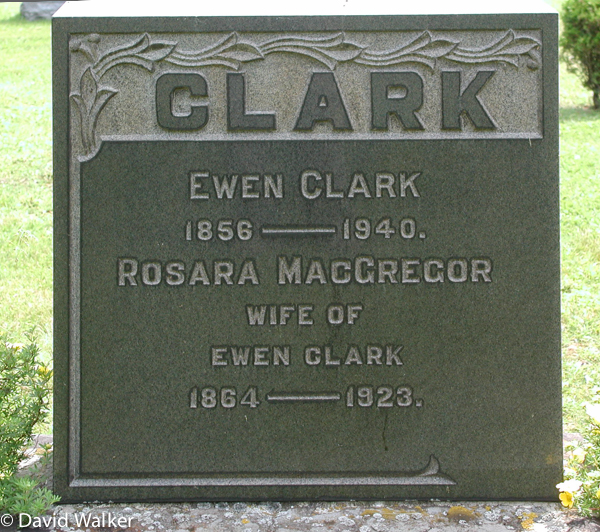 | Burial | He was buried on 10 April 1940 in the Peoples Cemetery, Summerside, Prince County, Prince Edward Island, CanadaG. Section O1, Row 6, Stone #1194Inscription: CLARK / Ewen Clark / 1856 - 1940. / Rosara MacGregor / Wife of / Ewen Clark / 1864 - 1923.Back: A. Wyman Clark / Apr. 11, 1907 - June 11, 1984 / His Wife / Amy Lois Inman / Aug. 1908 - Jan 29, 1974.7,8,2 Back inscription.  Tombstone, Ewen Clark (1856-1940) & Rosara MacGregor (1864-1923), their son Wyman Clark (1907-1984), his wife Lois Inman (1908-1974). |