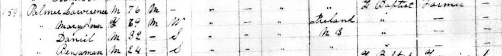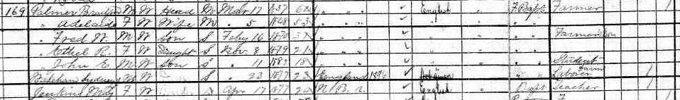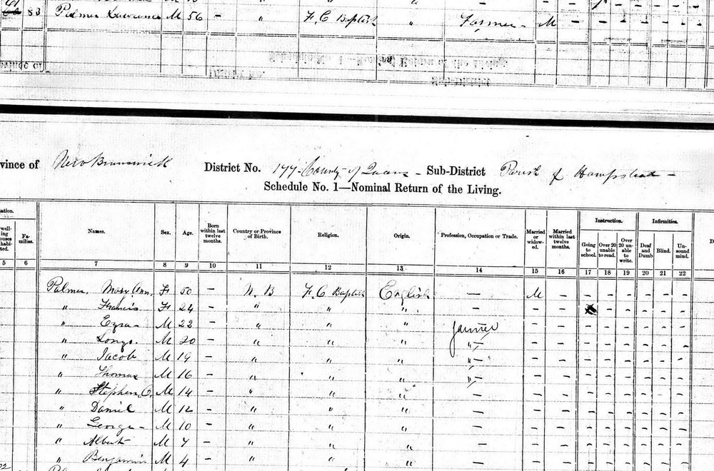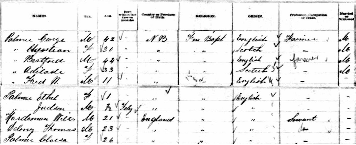 | Son | Benjamin Franklin Palmer was enumerated on the census on 4 April 1881 in the household of Lawrence Palmer, as a son, in Hampstead, Queens County, New Brunswick, CanadaG. included in the household of Lawrence (age 66) were his wife Mary Ann Fisher (age 60), sons Ezra (age 32), Elonzo (age 30), Jacob (age 28), Thomas (age 26), Stephen (age 24), Daniel (age 22), George (age 20), Albert (age 18) and Franklin (age 15). Lawrence's occupation was listed as farmer, as was the oldest son Ezra. The family religion was Free Christian Baptist.3![]() 1881 Canada Census - Lawrence ![]() 1881 Canada Census, Hampstead, Queens County, New Brunswick. Household #83 of Lawrence Palmer. Included in the household were his wife Mary Ann(Fisher), sons Ezra, Lonzo (Alonzo), Jacob, Thomas, Stephen, Daniel, George, Albert and Benjamin, and daughter Francis. Lawrence's occupation was listed as farmer., as was the oldest son Ezra. The family religion was Free Christian Baptist. |
