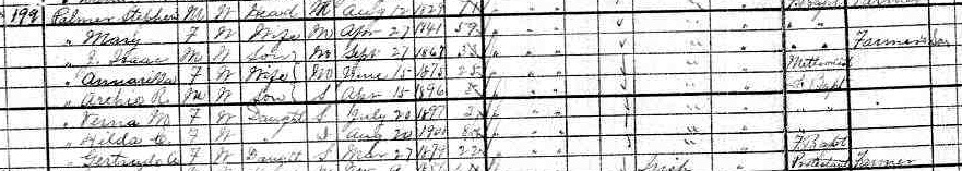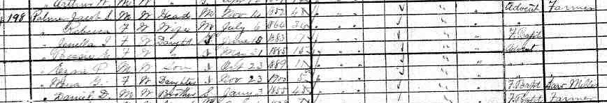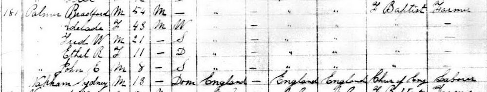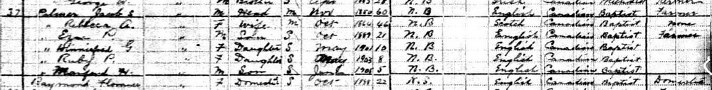 | Son | He was enumerated on the census on 1 June 1911 in the household of Mary Eliza Walker, as a son, in Lot 11, Freeland, Prince County, Prince Edward Island, CanadaG. Enumerated in the household with widowed Eliza (Walker) Palmer were her sons Robert, Allan Edgar and Ingham, and her mother-in-law, Isabell Palmer.5![]() 1911 Canada Census, Lot 11, household of Eliza (Walker) Palmer. Included in the household with widowed Eliza (Walker) Palmer were her sons Robert, Allan Edgar and Ingham, and her mother-in-law, Isabell Palmer. |