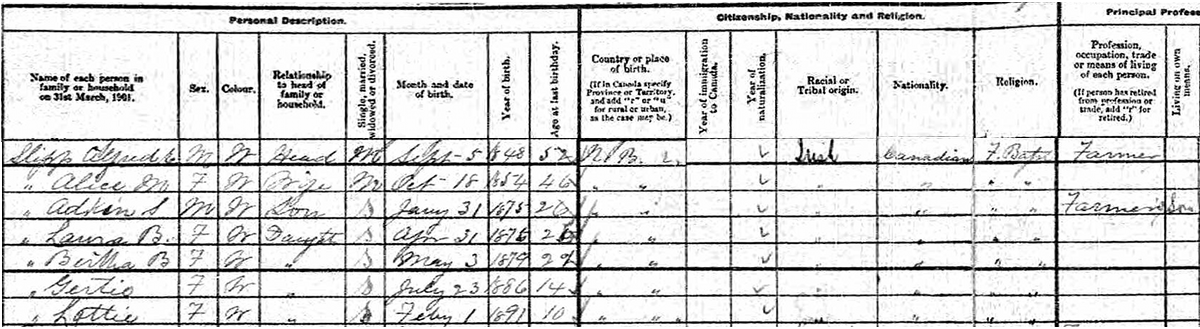 | Son | He was enumerated on the census on 17 April 1901 in the household of Alfred Ernest Slipp, as a son, in Parish of Hampstead, Queens County, New Brunswick, CanadaG. included in the household with Alfred (age 52) were his wife Alice Palmer (age 46), their children Adkin (age 26), Laura (age 25), Bertha (age 21), Gertie (age 14) and Lottie (age 10). Alfred was a farmer, Adkin a farmer's son. The family religion was Free Baptist.4![]() 1901 Canada Census, Hampstead Parish, Queens County, New Brunswick. Household of Alfred E. Slipp, his wife Alice M. Palmer, their children Adkin, Laura, Bertha, Gertie and Lottie. |