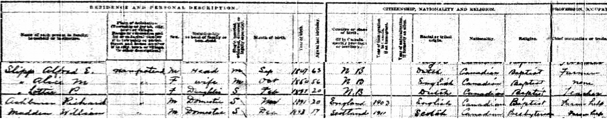 | Daughter | She was enumerated on the census in 1911 in the household of Alfred Ernest Slipp, as a daughter, in Hampstead, Queens County, New Brunswick, CanadaG. included in the household with Alfred (age 63) were his wife Alice Palmer (age 56), their daughter Lottie (age 20), and two unrelated domestics. Alfred was a farmer, Lottie was a teacher. The family religion was Baptist.6![]() 1911 Canada Census, Hampstead, Queens County, New Brunswick. Household of Alfred E. Slipp, his wife Alice M. Palmer, their daughter Lottie, and two unrelated farm helpers. |