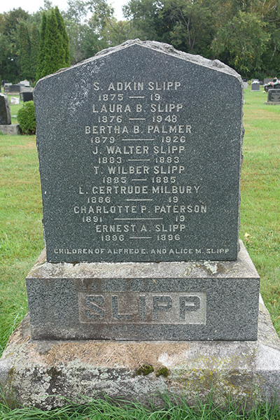 | Interred | She was buried in the plot of Alfred Ernest Slipp, in Rural Cemetery Extension, Fredericton, York County, New Brunswick, CanadaG. Inscription: .Alfred E. Slipp / Died Dec. 27, 1930 / Aged 82 Years, / His Wife / Alice M. Slipp / Died Nov. 2, 1911 / Aged 63 Years / SLIPP Back: S. Adkin Slipp / 1875 - 19 / Laura B. Slipp / 1876 - 1948 / Bertha B. Palmer / 1879 - 1926 / J. Walter Slipp / 1883 - 1883 / T. Wilber Slipp / 1885 - 1885 / L. Gertrude Milbury / 1886 - 19 / Charlotte P. Paterson / 1891 - 19 / Ernest A. Slipp / 1896 - 1896 / Children of Alfred E. and Alice M. Slipp / SLIPP.8,9 ![]() Tombstone, Alfred E. Slipp (1848-1930), his wife Alice Maud Palmer (1854-1917). Upper Rural Cemetery Extension, Fredericton, York County, New Brunswick, Canada. ![]() Tombstone, Children of Alfred E. Slipp (1848-1930), his wife Alice Maud Palmer (1854-1917). S. Adkin (1875-19??), Laura B. (1876-1948), Bertha B. (1879-1926), J. Walter (1883-1883), T. Wilbur (1885-1885), Ernest A. (1896-1896). Upper Rural Cemetery Extension, Fredericton, York County, New Brunswick, Canada. |