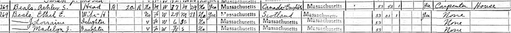 | Census | Ashley Sherman Beals was head of the household in the census on 14 April 1930 in Rockland, Plymouth County, Massachusetts, USAG. included in the household were Ashley's wife Ethel (Aitken), and daughters Lorraine & Madeline/Madelyn. They lived in a rented house, at $20/month. Ashley's occupation was listed as house carpenter. They lived next door to Ashley's brother Norman.2 1930 US Census, household of Ashley Beals, his wife Ethel Aitken, and daughters Lorraine & Madeline/Madelyn. Rockland, Plymouth County, Massachusetts. |