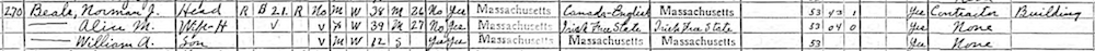| Witness | He was enumerated on the census on 5 January 1920 in the household of Hammond Johnson Beals in Rockland, Plymouth County, Massachusetts, USAG. included in the household with Hammond were his wife Nettie (Cushing), and sons Ralph & Ashley. Hammond's occupation was listed as building contractor, and both Ralph & Ashley were construction carpenters. Their home was owned, with an existing mortgage. Hammond emigrated from Prince Edward Island in 1877, and became a naturalized U.S. citizen in 1887.1 1920 US Census - household of Hammond J. Beals, his wife Nettie (Cushing), and their sons Ralph & Ashley. Rockland, Plymouth County, Massachusetts. |