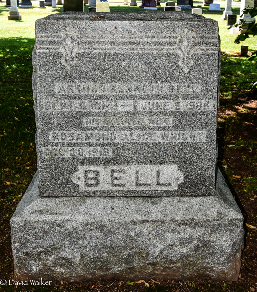 Inscription: Arthur Kenneth Bell / Sept. 6, 1914 - June 5, 1988 / His Beloved Wife / Rosamond Alice Wright / Dec. 20, 1918 - / BELLBack: J. Harlan 1916 - 1926 / Mary G. 1916 - 1918 / Clara Ann Bell / Dec. 19, 1888 - Oct. 17, 1981 / Our Mother / BELL.1,2  Cemetery marker, Arthur Kenneth Bell (1914-1988), his wife Rosamond Alice Wright (1918- ), his brother J. Harlan Bell (1916-1926), his sister Mary G. Bell (1916-1918), their mother Clara Ann Bowness (1888-1981). Peoples Cemetery, Summerside, Prince County, Prince Edward Island, Canada.  Back inscription detail.