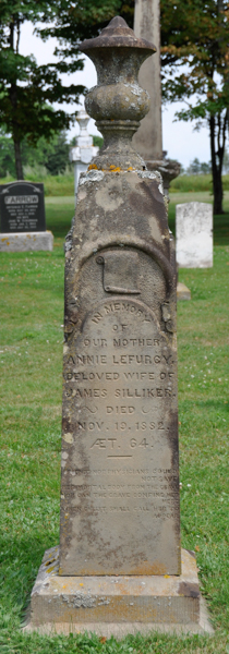 Inscription: In Memory / of / Our Mother / Annie Lefurgey / Beloved Wife of / James Silliker / Died / Nov. 19, 1882 / ÆT. 64 / Friends nor physicians could / not save / her mortal body from the grave / nor can the grave confine her / here / when Christ shall call her to / appearLeft: Margaret A. Silliker / Died / Jany. 28, 1879 / ÆT. 23Right: James Silliker / Born / Aug. 15, 1820 / Died / Jan. 20, 1907.1,3  Tombstone, Annie Lefurgey (1818-1882), her husband James Silliker (1820-1907), their daughter Margaret (1853-1879). United Baptist Cemetery, Central Bedeque, Prince County, Prince Edward Island, Canada.  Front inscription detail.  Left inscription detail.  Right inscription detail.