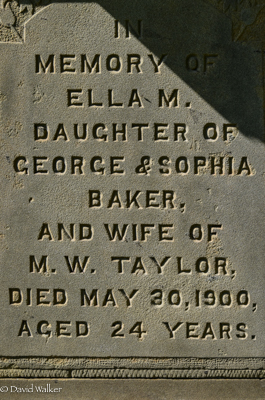 Inscription: In / Memory of / John Baker / Died Sept. 2, 1894, / Aged 77 Years | Also / His Wife / Caroline Agusta (1818-1903), Aged 85 YearsRight: In / Memory of / Ella M. / Daughter of George & Sophia / Baker, / And Wife of / M. W. Taylor, / Died May 30, 1900, / Aged 24 YearsBack: In Memory / of / George E. Baker / Born April 12, 1944 / Died Dec. 1, 1928 | In Memory/ of / Sophia J. Clark / Born Jan. 20th 1846 / Died Jan. 31st, 1917 / Wife of / Geo. E Baker.1  Cemetery marker, John Baker (c1817-1894), his wife Caroline Augusta Bagnall (1818-1903), their son George Baker (1844-1928), his wife Sophia Clark (1846-1917), their daughter Ella Baker (1876-1900). Peoples Cemetery, Summerside, Prince County, Prince Edward Island, Canada.  Right inscription detail.  Back inscription detail.