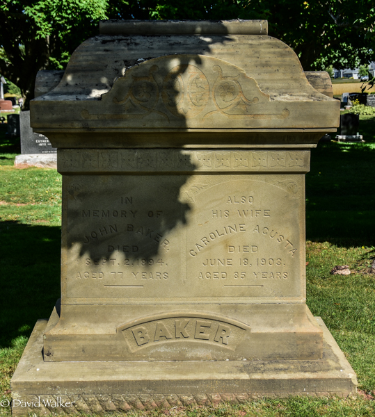 Inscription: In / Memory of / John Baker / Died Sept. 2, 1894, / Aged 77 Years | Also / His Wife / Caroline Agusta (1818-1903), Aged 85 YearsRight: In / Memory of / Ella M. / Daughter of George & Sophia / Baker, / And Wife of / M. W. Taylor, / Died May 30, 1900, / Aged 24 YearsBack: In Memory / of / George E. Baker / Born April 12, 1944 / Died Dec. 1, 1928 | In Memory/ of / Sophia J. Clark / Born Jan. 20th 1846 / Died Jan. 31st, 1917 / Wife of / Geo. E Baker.2  Cemetery marker, John Baker (c1817-1894), his wife Caroline Augusta Bagnall (1818-1903), their son George Baker (1844-1928), his wife Sophia Clark (1846-1917), their daughter Ella Baker (1876-1900). Peoples Cemetery, Summerside, Prince County, Prince Edward Island, Canada.  Right inscription detail.  Back inscription detail.