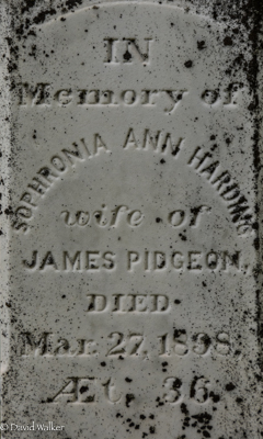 Inscription: In / Memory of / Sophronia Ann Harding / wife of / James Pidgeon / Died / Mar. 27, 1898, / Æt. 36. / PIDGEONRight: In / Memory of / James A. / Pidgeon / Died / Aug. 14, 1947, / ÆT. 79.2,1  Cemetery Marker: James A. Pidgeon (1867-1947), his wife Sophronia Ann Harding (1862-1898). St. Thomas Anglican Church Cemetery, Springbrook, Queens County, Prince Edward Island, Canada.  Front inscription detail.  Right inscription detail.
