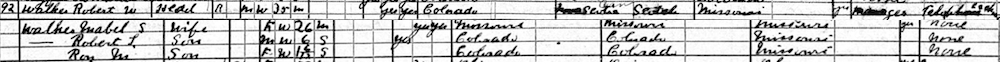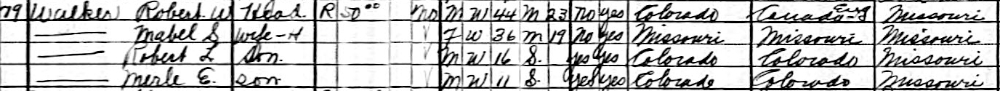 | Wife | Mabel Stacy Gilbreath was enumerated on the census on 12 January 1920 in the household of Robert Walton Walker, as his wife, in Collbran, Mesa County, Colorado, USAG. Enumerated in the household were Robert's wife Mabel (Gilbreath) and sons Robert & Roy. Robert's occupation was listed as Manager at the Telephone Exchange. Robert rented the house in which they lived.3![]() 1920 US Census of household of Robert Walton Walker, his wife Mabel (Gilbreath), and sons Robert and Roy (Merle). They lived in Collbran, Mesa County, Colorado. |