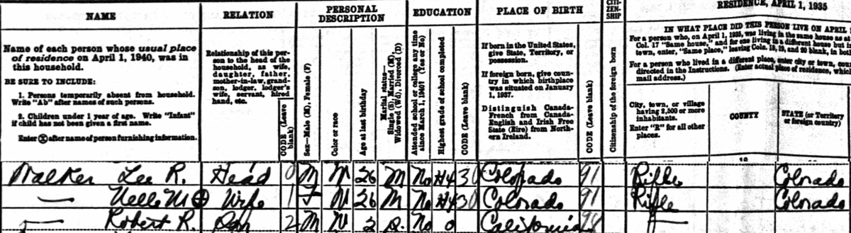 | Wife | She was enumerated on the census on 3 April 1940 in the household of Robert Lee Walker, as his wife, in 1007 West Cruces St., Rifle, Garfield County, Colorado, USAG. Enumerated in the household with Lee (age 26) were his wife Nelle (age 26) and their son Robert (age 2). He was an assistant service manager for an automobile garage.2![]() 1940 US Census, Rifle, Garfield County, Colorado. Household of Robert Lee Walker, his wife Nelle Estes and their son Robert. |