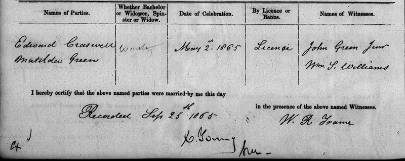 | Marriage | Edward Craswell married Caroline Matilda Green daughter of George Green and Caroline Ann Campbell, on 2 May 1865, in Prince County, Prince Edward IslandG. they were married by license, by Rev. W. R. Frame, recorded 25 September 1865. Witnesses were John Green Jr. and Wm. L. Williams.1![]() Marriage Registration, Edward Craswell and Matilda Green. |