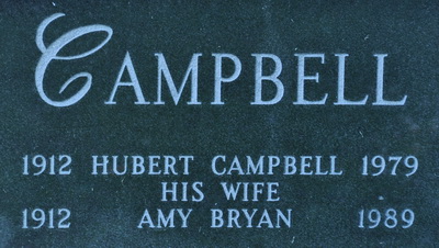 Inscription: CAMPBELL / David Campbell / 1875 - 1936 / His Wife / Eliza Hardy / 1877 - 1974.4  Tombstone, David Campbell (1875-1936), his wife Eliza Hardy (1877-1974). United Church Cemetery, Montrose, Prince County, Prince Edward Island.  Front inscription detail.