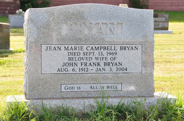 Inscription: BRYAN / Jean Marie Campbell Bryan / Died Sept. 13, 1969 / Beloved Wife of / John Frank Bryan / Aug. 6, 1912 - Jan. 3, 2004 / God is ... All is Well.4,5  Tombstone, Jean Marie Campbell (1905-1969), her husband John Frank Bryan (1912-2004). Hillcrest Cemetery, Alberton, Prince County, Prince Edward Island, Canada.