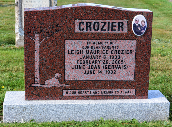 Inscription: CROZIER / In Memory of / Our Dear Parents / Leigh Maurice Crozier / JAnuary 6, 1933 / February 26, 2005 / June Joan (Gervais) / June 14, 1932 - / In Our Hearts and Memories Always.1,2  Tombstone, Leigh Maurice Crozier (1933-2005), his wife June Joan Gervais (1932- ). Peoples Cemetery, Malpeque, Prince County, Prince Edward Island, Canada.