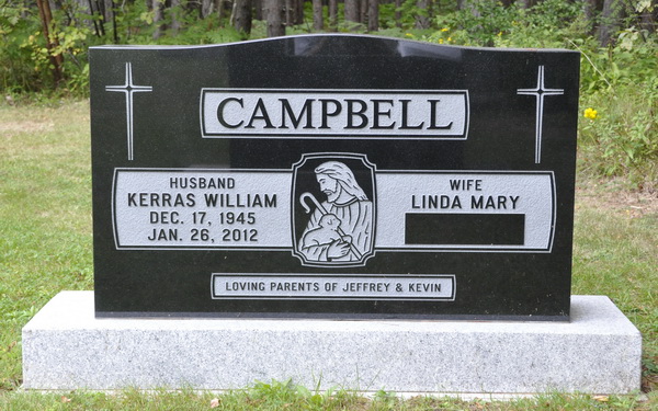 | Burial | He was buried in St. Peter's Anglican Cemetery, Alberton, Prince County, Prince Edward Island, Canada, 46.81862, -64.06160G. Inscription: CAMPBELL / Husband / Kerras William / Dec. 17, 1945 / Jan. 26, 2012 | Wife / Linda Mary // Loving parents of Jeffrey & Kevin.1,2![]() Tombstone, Kerras William Campbell (1945-2012), his wife Linda Mary Katowicz. St. Peter's Anglican Cemetery, Alberton, Prince County, Prince Edward Island, Canada. |