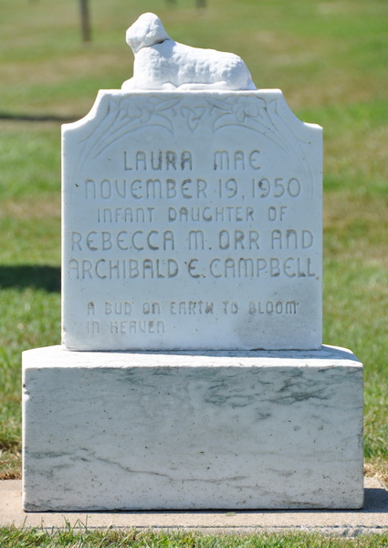 | Burial | She was buried in Geddie Memorial Cemetery, Springbrook, Queens County, Prince Edward Island, Canada, 46.49442, -63.50749G. stone #366. Inscription: Laura Mae / November 19, 1950 / Infant daughter of / Rebecca M. Orr and / Archibald E. Campbell / A bud on earth to bloom / in heaven.1![]() Tombstone, Laura Mae Campbell (1950-1950), his wife Rebecca M. Orr (1920-1998). Geddie Memorial Cemetery, Springbrook, Queens County, Prince Edward Island, Canada. |
