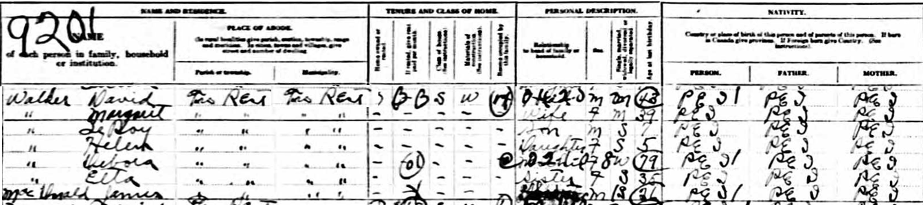 | Census | David Lowther Walker was head of the household in the census in 1921 in Travellers Rest, Prince County, Prince Edward Island, CanadaG. enumerated in the household with David (age 43) were his wife Margaret Ferguson (age 39), their children Leroy (age 7) & Helen (age 5), David's mother Deborah Lowther (age 79), his sister Etta (age 35) and James McDonald (age 26), an unrelated servant. David was a farmer, Leroy a student. The family religion was Presbyterian. enumerated in the household with David (age 43) were his wife Margaret Ferguson (age 39), their children Leroy (age 7) & Helen (age 5), David's mother Deborah Lowther (age 79), his sister Etta (age 35) and James McDonald (age 26), an unrelated servant. David was a farmer, Leroy a student. The family religion was Presbyterian.11![]() 1921 Canada Census, Travellers Rest, Prince County, Prince Edward Island. Household of David Walker, his wife Margaret Ferguson, their children Leroy & Helen, David's mother Debora Lowther, David's sister Etta and an unrelated James McDonald. Census image courtesy of Library & Archives Canada. |