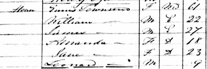 | Witness | He was enumerated on the census in 1851 in the household of Eunice Read in Jolicure, Westmorland County, New BrunswickG. included in the household with Eunice (age 61), now widowed, were four of her children, William (age 22), James (age 27), Amanda (age 18) and Jane (age 23). There was also a yet identified person, Leonard Townsend (age 9). They lived on the property adjacent to Eunice's son John Townsend.4 1851 Canada East Census, Jolicure, Westmorland County, New Brunswick. Household of Eunice (Read) Townsend, and four of her children, William, James, Amanda and Jane. |