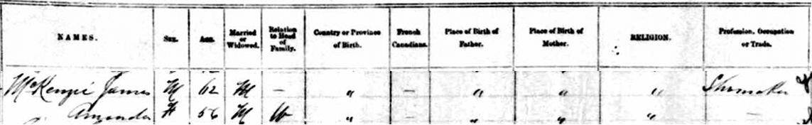 | Census | He was head of the household in the census in 1891 in Moncton, Westmorland County, New Brunswick, CanadaG. living in the household with James (age 62) was his wife Amanda Townsend (age 56). James was a shoemaker. They were both Baptists. Their daughter Agnes, who would have been 14 at this census, was not enumerated, and is possibly deceased.1 1891 Canada Census, Moncton, Westmorland County, New Brunswick. Household of James McKenzie and his wife Amanda Townsend. |