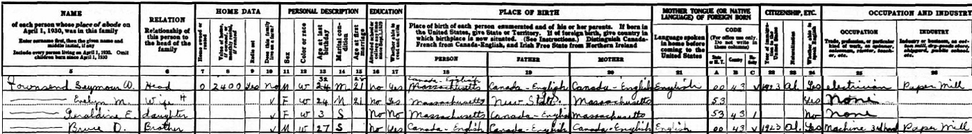 | Witness | He was enumerated on the census on 3 April 1930 in the household of William Seymour Townsend in Pepperell, Middlesex County, Massachusetts, USAG. included in the household with Seymour (age 32) were his wife Evelyn Marshall (age 24), their daughter Geraldine (age 3) and Seymour's brother Bruce Townsend (age 27). Seymour was an electrician in a paper mill, Bruce was a machine operator in a paper mill.5 1930 US Census, Pepperell, Middlesex County, Massachusetts. Household of Seymour Townsend, his wife Evelyn Marshall, their daughter Geraldine and Seymour's brother Bruce. |