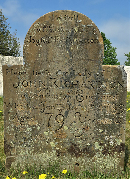 Inscription: RICHARDSON / Joseph Providence / Born in 1774 / Aboard the / Ship Providence / on the Trip from / Yorkshire, England / Died 27 July 1846 / Aged 72 Years / His Wife / Jane / Died 5 August 1848 / Aged 65 Years / Placed in 2011 by / Richardson / Descendants.3  Marker, Joseph Providence Richardson (1774-1846). Lower Sackville Methodist Cemetery, Sackville, Westmorland County, New Brunswick, Canada. Photo courtesy of findagrave.com.