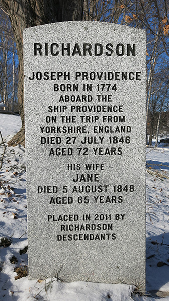 Inscription: RICHARDSON / Joseph Providence / Born in 1774 / Aboard the / Ship Providence / on the Trip from / Yorkshire, England / Died 27 July 1846 / Aged 72 Years / His Wife / Jane / Died 5 August 1848 / Aged 65 Years / Placed in 2011 by / Richardson / Descendants.3  Marker, Joseph Providence Richardson (1774-1846). Lower Sackville Methodist Cemetery, Sackville, Westmorland County, New Brunswick, Canada. Photo courtesy of findagrave.com.