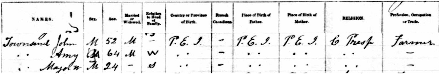 - [S7848] 1901 Canada Census, Lot 19 Prince County, Prince Edward Island, household #106 of Thomas Townsend, 25 April 1901, digital image of original page, Roll T-6428 to T-6556, Page 12. Library & Archives Canada, Library & Archives Canada; 395 Wellington St., Ottawa,, Ontario, Canada.
