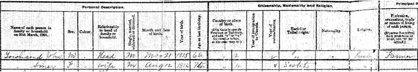 | Witness | She was enumerated on the census on 25 April 1901 in the household of Thomas Townsend in Lot 19, Prince County, Prince Edward Island, CanadaG. included in the household with Thomas (age 66) were his wife Amy Green (age 58), their children Colin (age 31), Albenia (age 27) and Annie (age 24). Thomas and Colin were farmers. The family religion was Presbyterian.6 1901 Canada Census, Lot 19, Prince County, Prince Edward Island. Household of Thomas Townsend, his wife Amy Green, their children Colin, Albenia and Annie. |