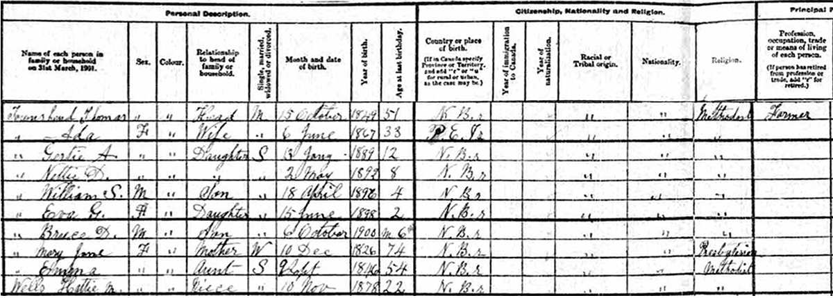 | Census | He was head of the household in the census in 1891 in Botsford Parish, Westmorland County, New BrunswickG.2,1 |