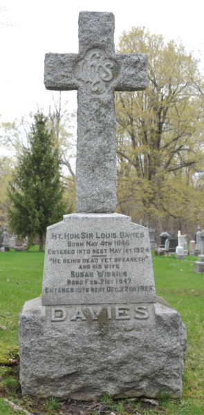 | Burial | He was buried on 3 May 1924 in Beechwood Cemetery, Ottawa, Ontario, Canada, 45.44591, -75.66355G. Inscription: Rt. Hon. Sir Louis Davies / Born May 4th 1845 / Entered into Rest May 1st 1924 / "He being dead yet speaketh" / And His Wife / Susan Wiggins / Born Feb. 21st, 1847. / Entered into Rest Dec. 22nd 1925. / DAVIESLeft: Gertrude Davies / 1873 - 1956 / Mary Florence Magrath / 1888 - 1975Right: Maude Davies / 1873 - 1963 (Maude is a niece, daughter of Louis Henry's brother Benjamin.)6,19,20![]() Tombstone, Rt. Hon. Sir Louis Davies, his wife Susan Wiggins, their daughters Gertrude, Mary Florence and Maude. Beechwood Cemetery, Ottawa, Ontario, Canada. ![]() Front inscription detail. ![]() Left inscription detail. ![]() Right inscription detail. |