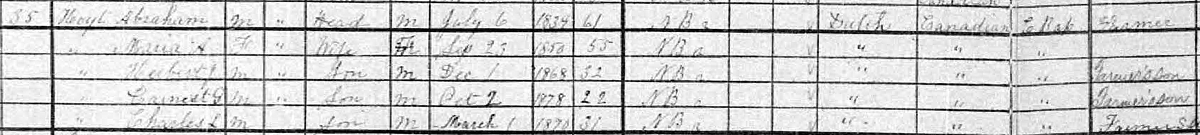 | Census | J. Abraham Hoyt was head of the household in the census on 31 March 1901 in Prince William, York County, New Brunswick, CanadaG. included in the household were Abraham's wife Maria, sons Herbert (age 32), Earnest (age 22) and Charles (age 31). Abraham was a farmer, and all three sons were listed as farmer's son. The family religion was Baptist.2 1901 Canada Census, Prince William, York County, New Brunswick. Household of Abraham Hoyt, his wife Maria and three sons, Herbert, Earnest and Charles. |