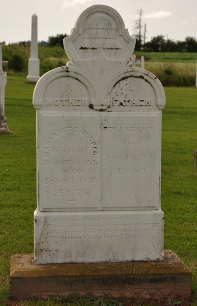 | Burial | He was buried in Bedeque Cemetery, Lower Bedeque, Prince County, Prince Edward Island, Canada, 46.34676, -63.73400G. Inscription: (tablet format): (Left side) Mother / Margaret G. Hooper / Wife of / Benj. Wright / Died / Feb. 14, 1895. / Æ t. 76. (Right side) Father / Benj. Wright / Died / Nov. 30, 1900. / Æ t. 80. / Alseep in Jesus blessed sleep / From which none ever wake to weep / A calm and undisturbed repose / Unbroken by the last of foes. Purdy.4 Tombstone, Benjamin Wright & Margaret C. Hooper, Bedeque Cemetery (aka United Church Cemetery, Lower Bedeque), Prince County, Prince Edward Island.  Inscription detail. |