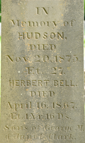 | Burial | She was buried in the United Church Cemetery, Cascumpec, Prince County, Prince Edward Island, Canada, 46.76347, -64.10767G. Inscription: In / memory of / George M. Clark / Died / Oct. 2, 1896, / AEt. 72. / Also his wife / Jane C. / Died / Dec. 1, 1877, / AEt. 53Back: In / memory of / Hudson, / Died Nov. 20, 1875, / AEt. 27. / Herbert Bell, / Died / April 16, 1867, / AEt. 1 Yr. 16 D's. / Sons of George M. / & Jane C. Clark.2 Tombstone, George M. Clark, his wife Jane Caroline Hood, and children Hudson & Herbert Bell. United Church Cemetery, Cascumpec, Prince County, Prince Edward Island, Canada.  Front inscription detail.  Right inscription detail. |