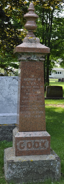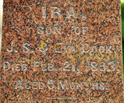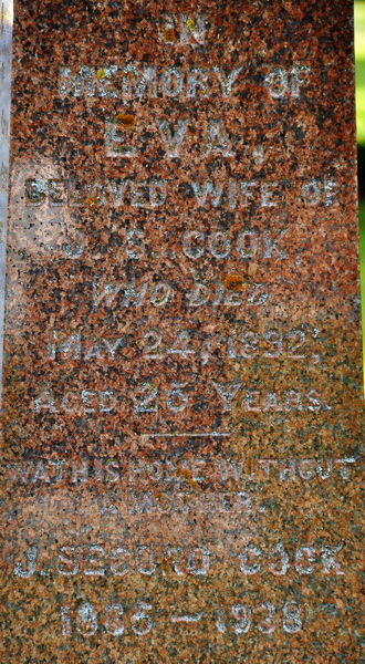 Section K3, Row 1, Stone #851. Inscription: In / Memory of / Eva, / Beloved Wife of / J. S. Cook / Who Died / May 24, 1892, / Aged 25 years. / -- / What is home without / a mother / J. Secord Cook / 1865 - 1938.3,5  Tombstone, Eva Callbeck (1867-1892), her husband J. Secord Cook (1865-1938), their son Ira (1892-1893). Peoples Cemetery, Summerside, Prince County, Prince Edward Island, Canada.  Front inscription detail.  Left inscription detail.