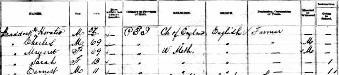| Witness | Margaret Hooper was enumerated on the census in 1881 in the household of Horatio Hope Braddock in Lot 36, Queens County, Prince Edward Island, CanadaG. included in the household with Horatio (age 37), never married, were his parents, Charles Braddock (age 69) and Margaret Hooper (age 69), niece Sarah Matilda Braddock (age 13) and nephew Earnest Goldsmith Braddock (age 11), both children of Horatio's brother, Charles Elisha Braddock. Horatio was a farmer. Sarah and Earnest were in school. Horatio and his father Charles were Anglican, while the remainder of the household were Wesleyan Methodists.3 1881 Canada Census, Lot 36, Queens County, Prince Edward Island. Household of Horatio Hope Braddock, his parents, Charles Robert Braddock and Margaret Hooper, niece Sarah Matilda Braddock, nephew Earnest Goldsmith Braddock, children of Horatio's brother Charles Elisha Braddock. |