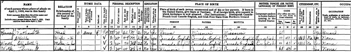| Mother | She appeared on the census on 14 January 1920 in the household of Lora Ann Worth as her mother, in Yankee Hill, Lancaster County, Nebraska, USAG. Enumerated in household with widowed Lora (Worth) Radcliffe (age 32) were her son Jeane (age 13) and widowed mother Elizabeth (Walker) Worth (age 59). Lora was a milliner. Lora was actually not a widow at this census, but had been abandoned by her husband in favour of another woman, with whom he subsequently had two children.9 1920 US Census, Yankee Hill, Lancaster County, Nebraska. Household of widowed Laura/Lora (Worth) Wolfe, her son Jean/Jeane Franklin Radcliffe and her widowed mother Elizabeth Jane (Walker). |