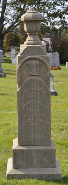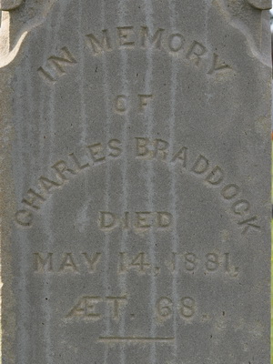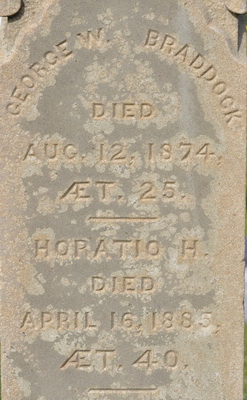 | Burial | She was buried in the Peoples Cemetery, Mount Stewart, Queens County, Prince Edward Island, Canada, 46.36367, -62.84997G. In Memory / of / Charles Braddock / Died / May 14, 1881 / ÆT. 68Left: George W. Braddock / Died / Aug. 12, 1874 / ÆT. 25 / - / Horatio H. / Died / April 16, 1885, / ÆT. 40Right: Also his wife / Margaret Hooper / Died / Aug. 11, 1889, / ÆT. 78.4 Tombstone, Charles Braddock (1813-1881), his wife Margaret Hooper (1811-1889), their sons George (1849-1874) and Horatio (1844-1885). The Peoples Cemetery, Mount Stewart, Queens County, Prince Edward Island, Canada.  Front inscription detail.  Left inscription detail.  Right inscription detail. |