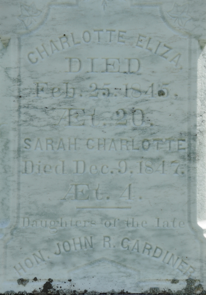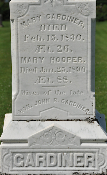 | Burial | She was buried in United Church (Bedeque) Cemetery, Lower Bedeque, Prince County, Prince Edward Island, Canada, 46.34690, -63.73397G. tall square obelisk.Inscription: In / Memory of / Hon. John R. Gardiner / Died / Sept. 10, 1874, / Æt. 77.Left: Mary Gardiner, / Died / Feb. 15, 1830, / Æt. 26. / Mary Hooper, / Died Jan. 25, 1890 / Æt. 88. / - / Wives of the late / Hon. John R. GardinerRight: Charlotte Eliza / Died / Feb. 25, 1845, / Æt. 20. / Sarah Charlotte / Died Dec. 9, 1847, / Æt. 4. / Daughters of the late / Hon. John R. Gardiner.1 Tombstone for Hon. John Rhodes Gardiner (1798-1874), his wives Mary Gardiner (1804-1830) & Mary Hooper (1802-1890), Charlotte Eliza (1825-1845), daughter of John Gardiner and his first wife, Mary Gardiner, and Sarah Charlotte (1843-1847), daughter of John Gardiner and his second wife, Mary Hooper. United Church Cemetery (Bedeque Cemetery), Lower Bedeque, Prince Edward Island, Canada.  Front inscription detail.  Left inscription detail.  Right inscription detail. |