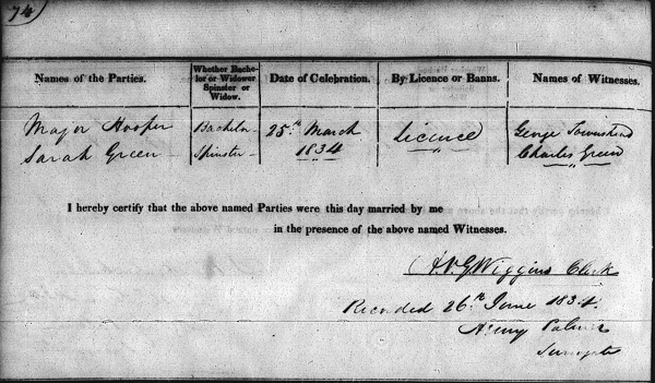 - [S5321] , (25 March 1834), Prince Edward Island Marriage Registers, 1832-1888 (1832-1840), Page 74, Image 38, Major Hooper & Sarah Green. Hereinafter cited as Prince Edward Island Marriage Registers.