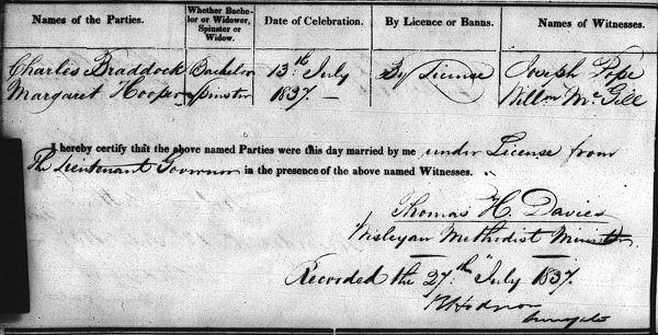 | Marriage | She married Charles Robert Braddock son of Samuel Clark Braddock and Eleanor Saunderson, on 12 July 1837, in Prince Edward IslandG. they were married by license, by Thomas H. Davies, Wesleyan Methodist Minister, recorded 27 July 1837. Witnesses were Joseph Pope and William McGill.2 Marriage Record, Charles Robert Braddock and Margaret Hooper, 13 July, 1837. |