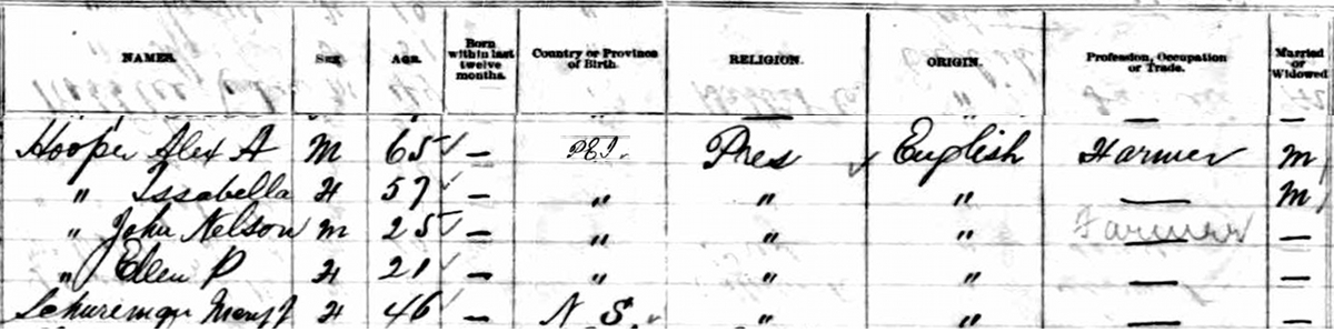 | Witness | Isabella Cole was enumerated on the census in 1881 in the household of Alexander A. Hooper in Lot 26, Prince County, Prince Edward Island, CanadaG. included in the household with Alexander (age 65) were his wife Isabella (age 57), son John Nelson (age 25), daughter Ellen (age 21), also Mary J. Schureman (age 46), daughter of Alexander's sister Ann & John Baker Schurman. Alexander and his son were farmers. The family religion was Presbyterian.4 1881 Canada Census, Lot 26, Prince County, Prince Edward Island. Household of Alexander A. Hooper, his wife Isabella Cole, son John Nelson, daughter Ellen and Mary J. Schureman. |
