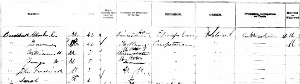 | Census | He was head of the household in the census in 1881 in Beauce, Woburn & Ditchfield, Québec, CanadaG. included in the household with Charles (age 43) were his wife Jeannie (age 40), children William (age 7), George (age 5), John Frederick (age 3) and Sarah (age 2). Charles was a farmer. His religion was Episcopalian, Jeannie and the children were Presbyterian.2 1881 Canada Census, Beauce, Québec. Household of Charles Elisha Braddock, his wife Jeannie and children, William, George, John Frederick and Sarah. |