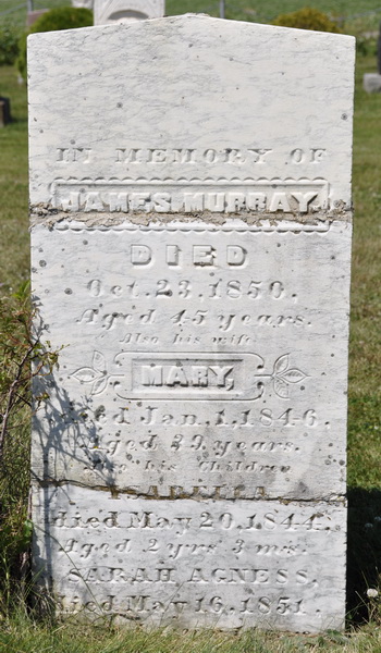 Inscription: In Memory of / James Murray / Died / Oct. 30, 1850, / Aged 45 years. / Also His Wife / Mary / died Jan. 1, 1846, / Aged 39 years. / Also his children / Isabella / died May 20, 1844, / Aged 2 y'rs 2 m's / Sarah Agness, / died May 16, 1851, / aged 1 yr. 11 m's.3,2  Tombstone, James Murray (1805-1850), his wife Mary Hooper (1807-1846), his daughters Isabella (1842-1844) and Sarah Agness (1849-1851). North Bedeque Cemetery, North Bedeque, Prince County, Prince Edward Island, Canada.