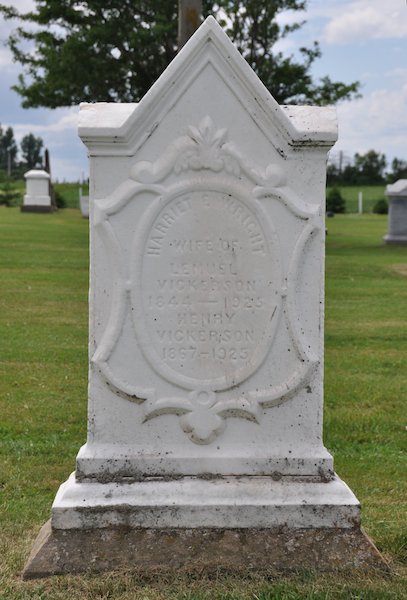 | Burial | He was buried in Bedeque United Church Cemetery, Lower Bedeque, Prince County, Prince Edward Island, Canada, 46.34710, -63.73366G. Inscription: Harriet E. Wright / Wife of / Lemuel / Vickerson / 1844 - 1925 / Henry / Vickerson / 1867 - 1925.2 Tombstone, Harriet Wright (1844-1925) her son Henry Vickerson (1867-1925). Bedeque United Church Cemetery, Lower Bedeque, Prince County, Prince Edward Island, Canada.  Detail of inscription. |