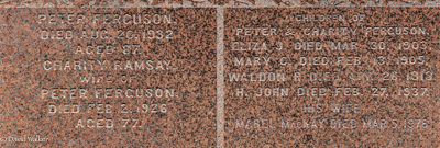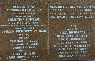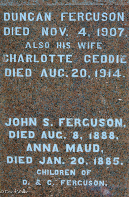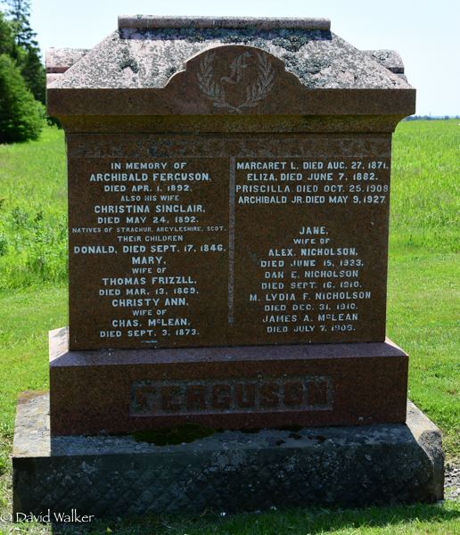 | Interred | He was buried in the plot of Archibald Ferguson, in the United Church Cemetery, Summerfield, Queens County, Prince Edward Island, Canada, 46.39626, -63.54034G. Inscription: In Memory of / Archibald Ferguson / Died Apr. 1, 1892. / Also His Wife / Christina Sinclair / Died May 24, 1892. / Natives of Strachur, Argyleshire, Scot. / Their Children / Donald, Died Sept. 17, 1846, / Mary / Wife of Thomas Frizzll, [sic] / Died Mar. 13, 1869. / Christy Ann, / Wife of Chas. McLean / Died Sept. 3, 1873 | Margaret L. Died Aug. 27, 1871. / Eliza, Died June 7, 1882. / Priscilla. Died Oct. 25, 1908. / Archibald Jr. Died May 9, 1927. / Jane, / Wife of / Alex. Nicholson. / Died June 15, 1933. / Dan E. Nicholson /Died Sept. 16, 1910. / M. Lydia F. Nicholson / Died Dec. 31, 1910. / James A. McLean / Died July 7, 1906.Left: Catherine, Wife of / Wm. Donald, / 1841 - 1931.Right: Duncan Ferguson / Died Nov. 4, 1907. / Also His Wife / Charlotte Geddie / Died Aug. 20, 1914. / John S. Ferguson, / Died Aug. 8, 1888, Anna Maud, / Died Jan. 20, 1885. / Children of D. & C. Ferguson.Back: Peter Ferguson, / Died Aug. 20, 1932 / Aged 87. / Charity Ramsay, / Wife of / Peter Ferguson, / Died Feb. 2, 1926 / Aged 77. | Children of / Peter & Charity Ferguson, / Eliza J. Died Mar. 30, 1903, / Mary C. Died Feb 13, 1905. / Waldon R. Died Apr. 26, 1913. / H. John Died Feb. 27, 1937. / His Wife / Mabel McKay Died Mar. 5, 1978.1 ![]() Tombstone, Archibald Ferguson (1816-1892), his wife Christina Sinclair, their children Catherine (1841-1931), Donald (?-1846), Mary (?-1869), Christy Ann (?-1873), Margaret (?-1871), Elizabeth (?-1882), Priscilla (1858-1908), Archibald Jr. (1850-1927), Jane (1852-1933), her children Dan (?-1910) & Lydia (?-1910), Catherine (1841-1931), Duncan (1847-1907), his wife Charlotte Geddie Montgomery (1852-1914), their children John S. (?-1888) & Anna Maud (?-1885), Peter (1845-1932), his wife Charity Ramsay (1849-1926), their children Eliza (1884-1903), Mary (1880-1905), Walden (1887-1913), John (1891-1937), his wife Mabel MacKay (?-1978). United Church Cemetery, Summerfield, Queens County, Prince Edward Island, Canada. ![]() Front inscription detail. ![]() Left inscription detail. ![]() Right inscription detail. ![]() Back inscription detail. |