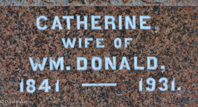 | Interred | She was buried in the plot of Archibald Ferguson, in the United Church Cemetery, Summerfield, Queens County, Prince Edward Island, Canada, 46.39626, -63.54034G. Inscription: In Memory of / Archibald Ferguson / Died Apr. 1, 1892. / Also His Wife / Christina Sinclair / Died May 24, 1892. / Natives of Strachur, Argyleshire, Scot. / Their Children / Donald, Died Sept. 17, 1846, / Mary / Wife of Thomas Frizzll, [sic] / Died Mar. 13, 1869. / Christy Ann, / Wife of Chas. McLean / Died Sept. 3, 1873 | Margaret L. Died Aug. 27, 1871. / Eliza, Died June 7, 1882. / Priscilla. Died Oct. 25, 1908. / Archibald Jr. Died May 9, 1927. / Jane, / Wife of / Alex. Nicholson. / Died June 15, 1933. / Dan E. Nicholson /Died Sept. 16, 1910. / M. Lydia F. Nicholson / Died Dec. 31, 1910. / James A. McLean / Died July 7, 1906.Left: Catherine, Wife of / Wm. Donald, / 1841 - 1931.Right: Duncan Ferguson / Died Nov. 4, 1907. / Also His Wife / Charlotte Geddie / Died Aug. 20, 1914. / John S. Ferguson, / Died Aug. 8, 1888, Anna Maud, / Died Jan. 20, 1885. / Children of D. & C. Ferguson.Back: Peter Ferguson, / Died Aug. 20, 1932 / Aged 87. / Charity Ramsay, / Wife of / Peter Ferguson, / Died Feb. 2, 1926 / Aged 77. | Children of / Peter & Charity Ferguson, / Eliza J. Died Mar. 30, 1903, / Mary C. Died Feb 13, 1905. / Waldon R. Died Apr. 26, 1913. / H. John Died Feb. 27, 1937. / His Wife / Mabel McKay Died Mar. 5, 1978.1 ![]() Tombstone, Archibald Ferguson (1816-1892), his wife Christina Sinclair, their children Catherine (1841-1931), Donald (?-1846), Mary (?-1869), Christy Ann (?-1873), Margaret (?-1871), Elizabeth (?-1882), Priscilla (1858-1908), Archibald Jr. (1850-1927), Jane (1852-1933), her children Dan (?-1910) & Lydia (?-1910), Catherine (1841-1931), Duncan (1847-1907), his wife Charlotte Geddie Montgomery (1852-1914), their children John S. (?-1888) & Anna Maud (?-1885), Peter (1845-1932), his wife Charity Ramsay (1849-1926), their children Eliza (1884-1903), Mary (1880-1905), Walden (1887-1913), John (1891-1937), his wife Mabel MacKay (?-1978). United Church Cemetery, Summerfield, Queens County, Prince Edward Island, Canada. ![]() Front inscription detail. ![]() Left inscription detail. ![]() Right inscription detail. ![]() Back inscription detail. |